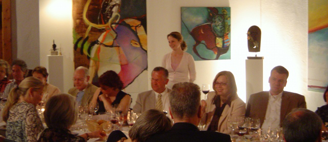 Zu jeweils zwei Weinen aus unserem Gut hatte Renate Schönmann, eine versierte Kennerin der veredelten Milchprodukte, jeweils einen besonderen Rohmilchkäse aus dem exquisiten Angebot des Käse-Spezialisten Wissmann präsentiert. Barbara Roth hat ebenso fachlich kompetent die ausgewählten Weine kommentiert. Inmitten der Kunst hatte der Abend ein ganz besonderes Flair.