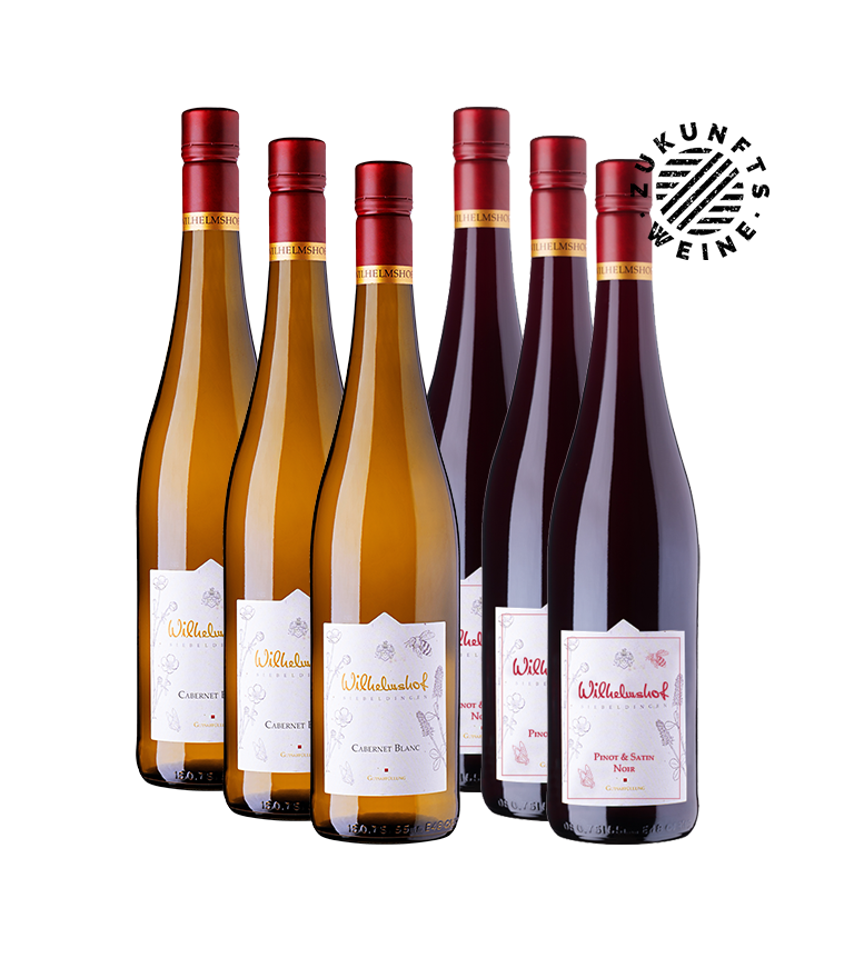 Dieses 6er-Probierpaket vereint unsere beiden Zukunftsweine: Cabernet Blanc und Satin Noir/Pinot Noir Cuvée. Beide Rebsorten gehören zu den PIWIs und stehen für einen besonders nachhaltigen Weinbau. Das Paket enthält je drei Flaschen und bietet die ideale Gelegenheit, die frische, aromatische Stilistik dieser innovativen Weine kennenzulernen – umweltschonend erzeugt und mit klarem Charakter.